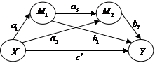以下图所示的含有两个中介变量的多重中介模型为例(其中的圆圈表示变量是潜变量),此时的多重中介效应分析可以从三个角度进行,(1)特定路径的中介效应,如,(2)总的中介效应,即,(3)对比中介效应,如