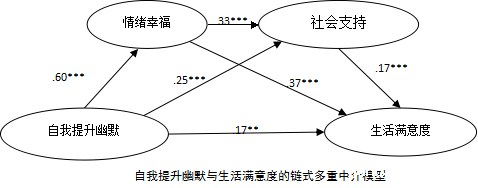 采用幽默风格问卷中的自我提升幽默维度、主观幸福感量表中的积极情绪和消极情绪维度、多维领悟社会支持量表和生活满意度量表对884名大学生进行调查。构建结构方程模型(见下图),Bootstrap检验表明了多重中介效应显著,总中介效果量为63.6%,其中通过情绪幸福这一中介路径的中介效果量最大,达47.3%。未来研究可探讨在个体主义文化背景下的不同链式中介效应。
