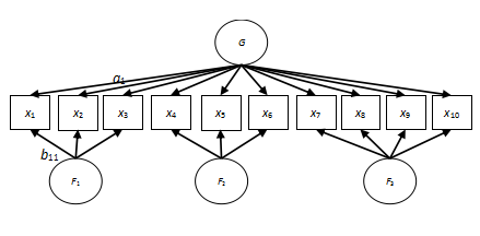 双因子模型是一种既有全局因子(G)又有局部因子(F1、F2、F3)的模型(见下图),近年来有了许多应用。本文讨论了双因子模型和高阶因子模型在数学模型、参数之间的关系,概念上和应用上的差异;概述了双因子模型在信度研究、平衡量表、探索性因子分析和项目反应理论中的应用。作为例子,在Rosenberg自尊量表结构的研究中,通过双因子模型分析了自尊特质效应与项目表述方法效应。
