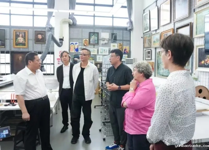 调研组一行首先来到广州美术学院校史馆参观,通过一件件实物、一幅幅图片,在时光穿梭中领略学院悠久的办学历史、厚重的人文底蕴、勃兴的发展态势。在学院“广东省艺术品保护修复与材料研究重点实验室”,李宜航与实验室负责人贾鹏教授及来自法国蓬皮杜当代艺术中心藏品保护修复首席技术官等专家学者亲切交流,观摩名画修复演示,听取艺术品修复与活化利用情况介绍。李宜航指出,艺术品特别是传世名画是人类文化瑰宝,其保护修复为推进文理交叉融合提供了丰富应用场景,推动着艺术品保护修复的迭代升级,建议专家团队在深化拓展研究的的同时,高度重视借助网络媒介搞好大众传播,打造像